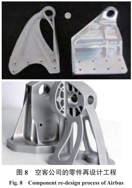 通用電氣公司專注于增材制造以降低其發(fā)動機(jī)制造成本,采用SLM技術(shù)已完成大量零部件的批量制造。圖7為航空發(fā)動機(jī)燃油噴嘴,將20個零件集成為1個部件進(jìn)行打印,減重25%,已實現(xiàn)數(shù)萬個部件的批量制造。此外,空客通過基于有限元分析的結(jié)構(gòu)優(yōu)化應(yīng)用于現(xiàn)有零部件的再設(shè)計,采用SLM技術(shù)實現(xiàn)了大幅減重,如圖8所示。