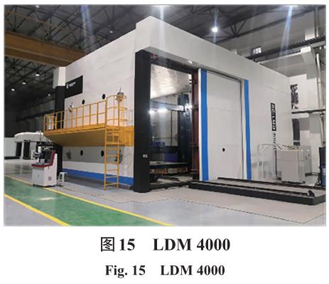 在 LMD 設(shè)備制造領(lǐng)域,以美國 EFESTO、德國EOS、西安鉑力特、南京中科煜宸、鑫精合激光等為代表的多家企業(yè)均已研發(fā)出工業(yè)級 LMD 設(shè)備,國內(nèi)外典型LMD設(shè)備主要參數(shù)如表3所示。南京中科煜宸研發(fā)的大型智能化雙光束裝備性能指標(biāo)達(dá)到國際先進(jìn)、國內(nèi)領(lǐng)先的水平,如圖 15所示,是國際上首次提出采用雙萬瓦級激光同步送粉打印技術(shù),沉積速度可達(dá) 700 cm3/h,設(shè)備剛性成型尺寸可達(dá)4 m×3.5 m×3 m,柔性成型尺寸達(dá)13 m×3.5 m×3 m,加工能力覆蓋了目前航空鈦合金主承力結(jié)構(gòu)件的所有門類,滿足未來型號及特殊構(gòu)件制造需求。此外,航空工業(yè)成飛集團(tuán)也研制了大型LMD同軸送粉設(shè)備,并實現(xiàn)了飛機(jī)增材制造工程化應(yīng)用。降低設(shè)備加工使用成本將是LMD設(shè)備未來的研究方向。大型構(gòu)件的應(yīng)力控制和變形開裂是LMD技術(shù)面臨的關(guān)鍵難題。